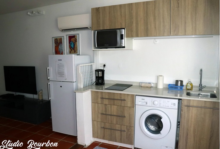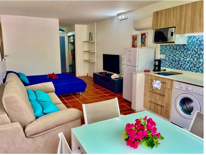 Ce studio dispose d’une cuisine équipée en terrasse.