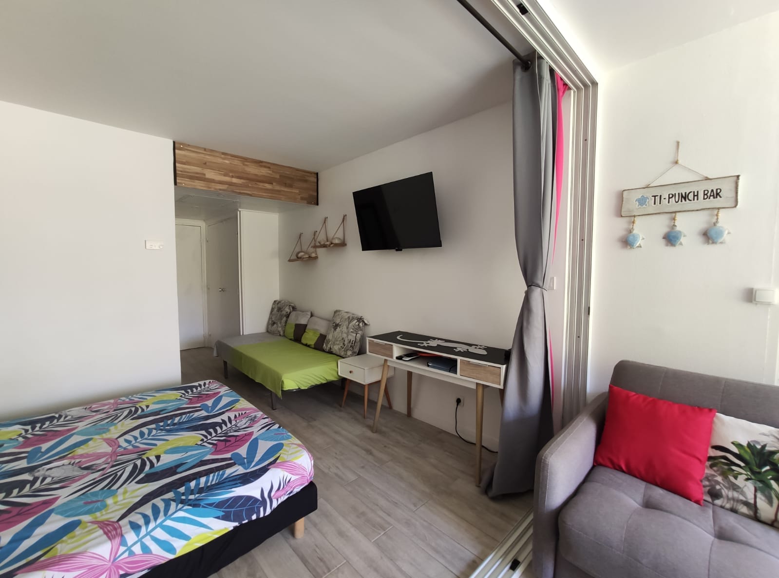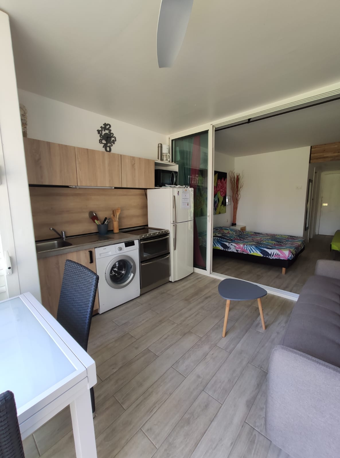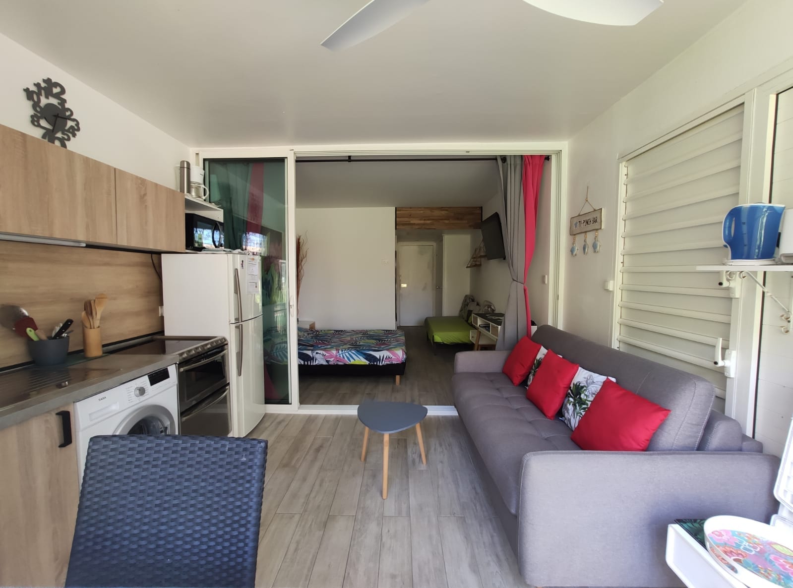 Studio de 29 M2, Salle de bain avec douche a l’italienne, vasque, placard dans l’entrée , dans la chambre principale un lit 90/190, possibilité d’un lit bébé avec moustiquaire, un lit 160/200 le tout dans une pièce climatisée, ensuite il y a une baie vitrée avec rideau, vous arrivez dans la cuisine équipée, avec un canapé convertible de très bonne qualité avec un vrai matelas 140/190, avec un brasseur d’air, et une vue directement sur la cocoteraie