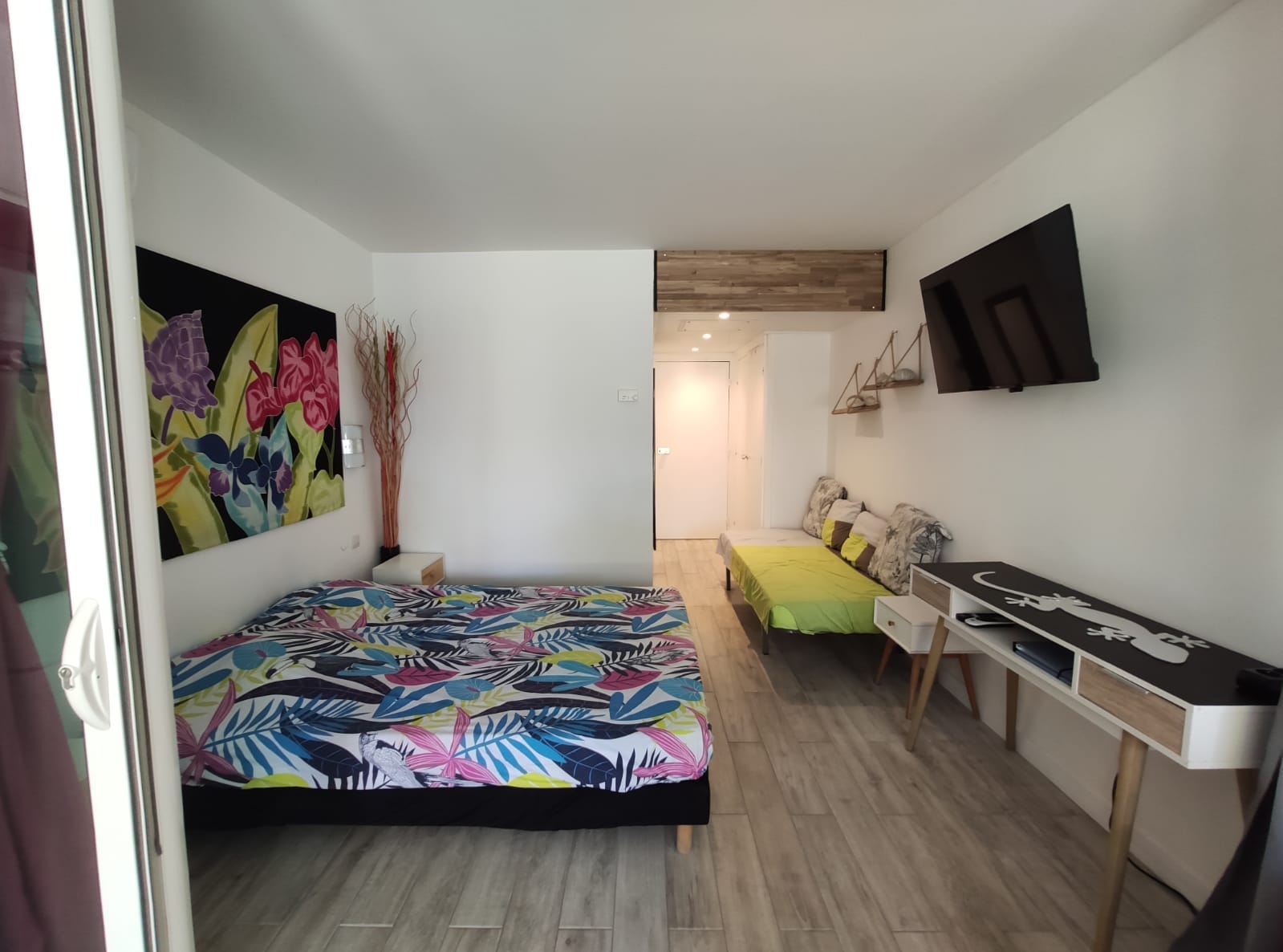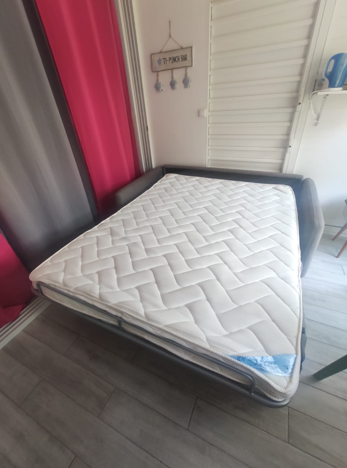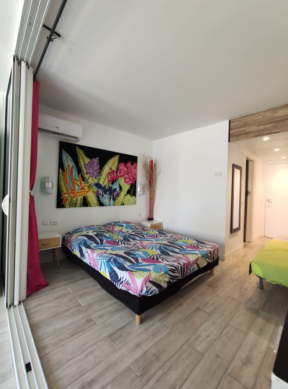 Studio de 29 M2, Salle de bain avec douche a l’italienne, vasque, placard dans l’entrée , dans la chambre principale un lit 90/190, possibilité d’un lit bébé avec moustiquaire, un lit 160/200 le tout dans une pièce climatisée, ensuite il y a une baie vitrée avec rideau, vous arrivez dans la cuisine équipée, avec un canapé convertible de très bonne qualité avec un vrai matelas 140/190, avec un brasseur d’air, et une vue directement sur la cocoteraie