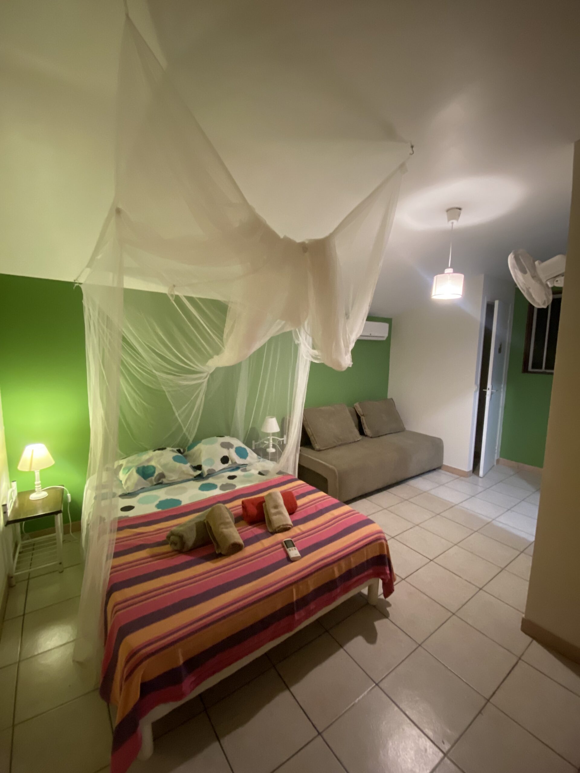 Chaque gite se compose de 1 chambre fermée de 12m² avec moustiquaires suspendues avec 1 lit double 140x190cm et 1 clic clac de bonne qualité dans chacune des chambres, une terrasse avec salon et cuisine toute équipée, une SDB avec douche à l’italienne, 1 WC séparé.